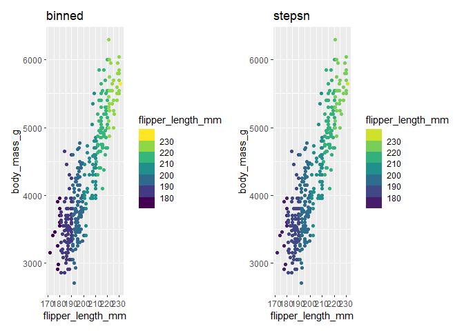 , which applies the full range of the viridis colour palette compared to adding viridis colours to scale_colour_stepsn
