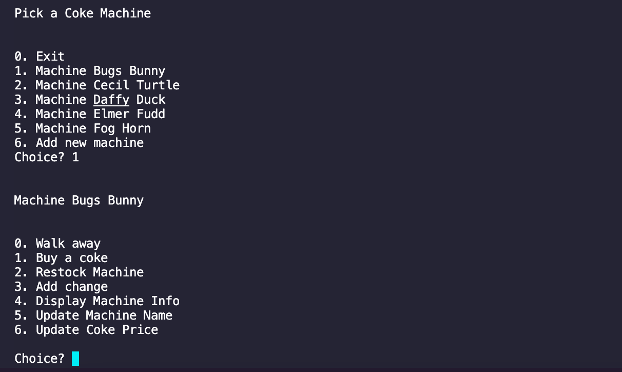 In this project I created a vending machine style simulation that allows the user to interactively request actions of the machine. Any amount of money is to be entered in increments of one penny, because the rounding of floating point numbers is not accurate for money (ex: $1.00 would be entered as "100"). The project gives a basic look at object-oriented programming with the use of inheritance.