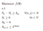 Given a project plan as directed graph $ G = (V,E) $ with activities $ V $, time lag relations $ E $, are weights $ \delta_{ij}, (i,j) \in E $ and starting times $ S_i, \forall i \in V$.