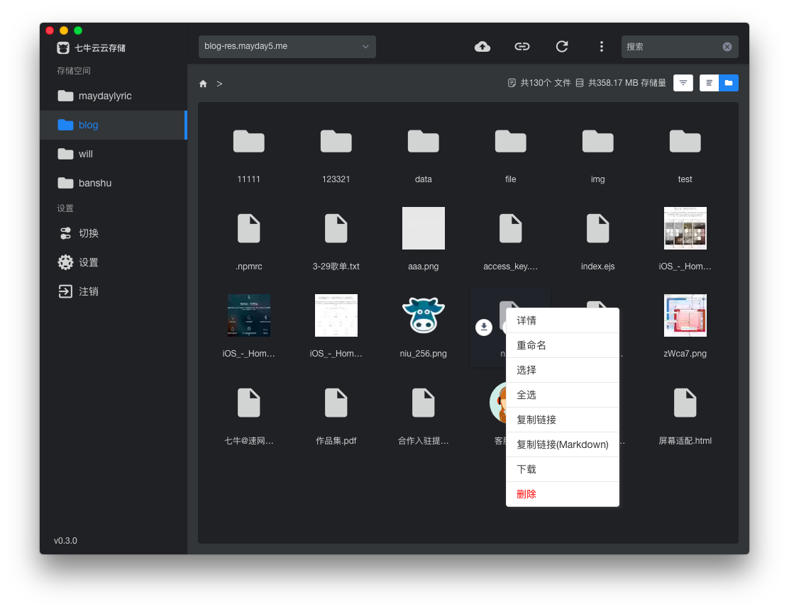 云存储管理客户端。支持七牛云、腾讯云、青云、阿里云、又拍云、亚马逊S3、京东云。仿文件夹式管理、图片预览、拖拽上传、文件夹上传、同步、批量导出URL等功能