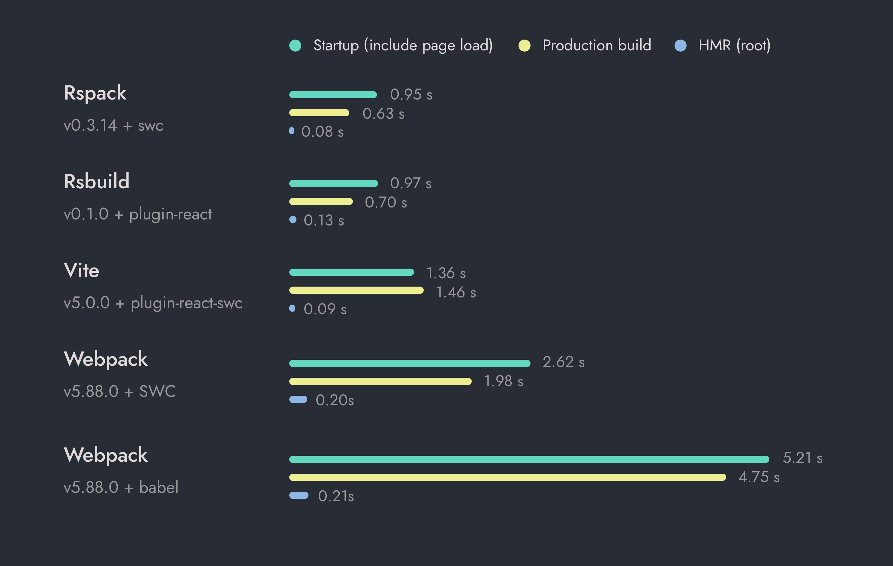 The build performance of Rsbuild is on a par with native Rspack. Considering that Rsbuild includes more out-of-the-box features, its performance will be slightly lower than Rspack.