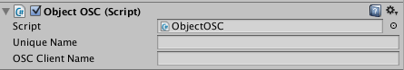 The ObjectOSC.cs script can be attached to any game object to report that game object's position when moved. This script has two public variables, Unique Name and OSC Client Name. If left blank, these variables will default to the name of the game object and the OSC Client specified by the Camera OSC script, respectively, but can be set differently if desired: